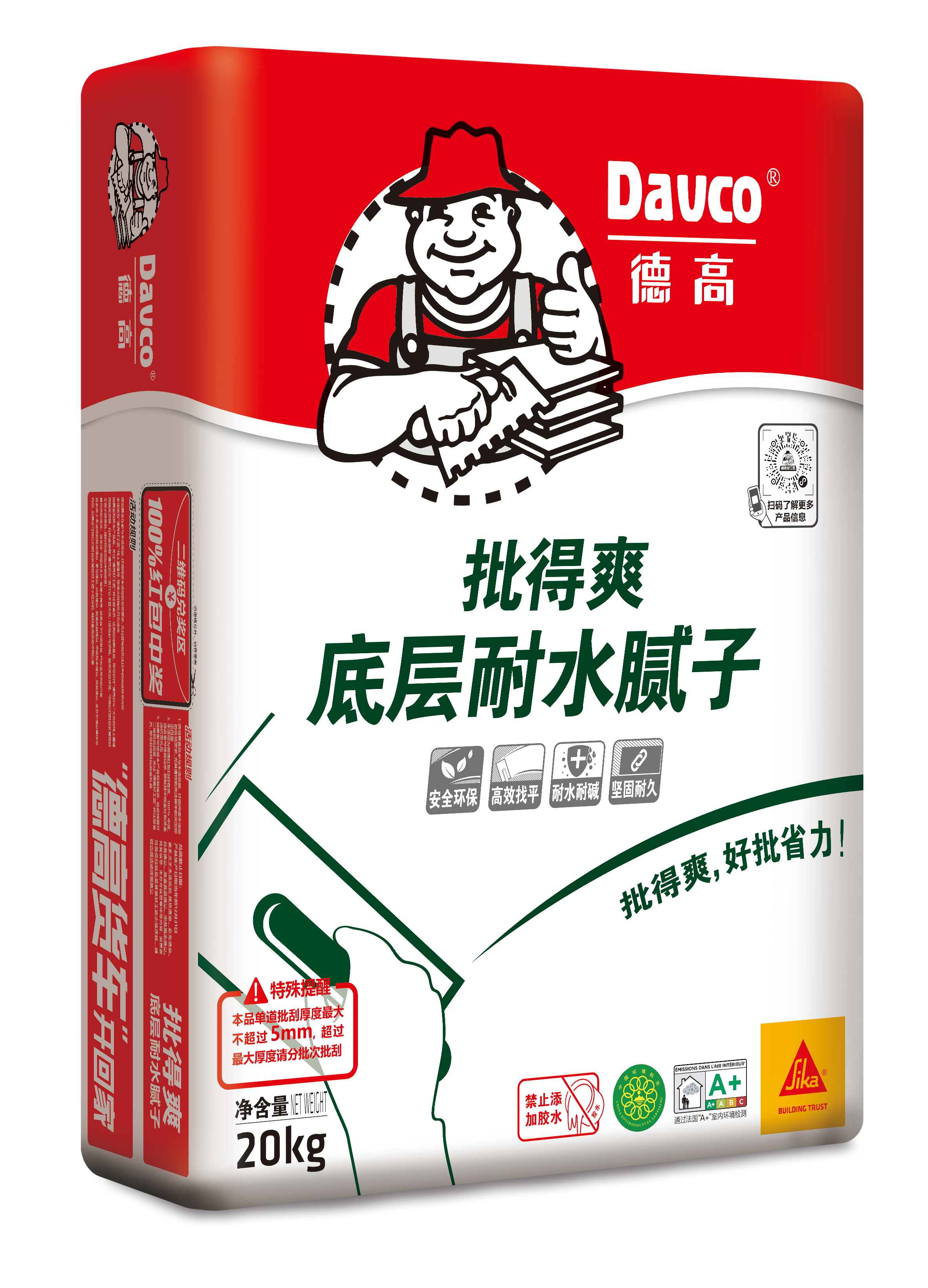 产品简介德高批得爽底层耐水腻子采用优良水泥、细砂、可再分散乳胶粉等聚合物及环保助剂制成。采用先进设备及生产工艺,整个生产过程不人为添加甲醛,绿色环保,品质稳定。本品用于墙体基层找平处理,找平效率高,不易开裂,且耐水耐碱,使用后基层平整度好,配套德高面层腻子使用,墙体平整、坚固、耐久。
