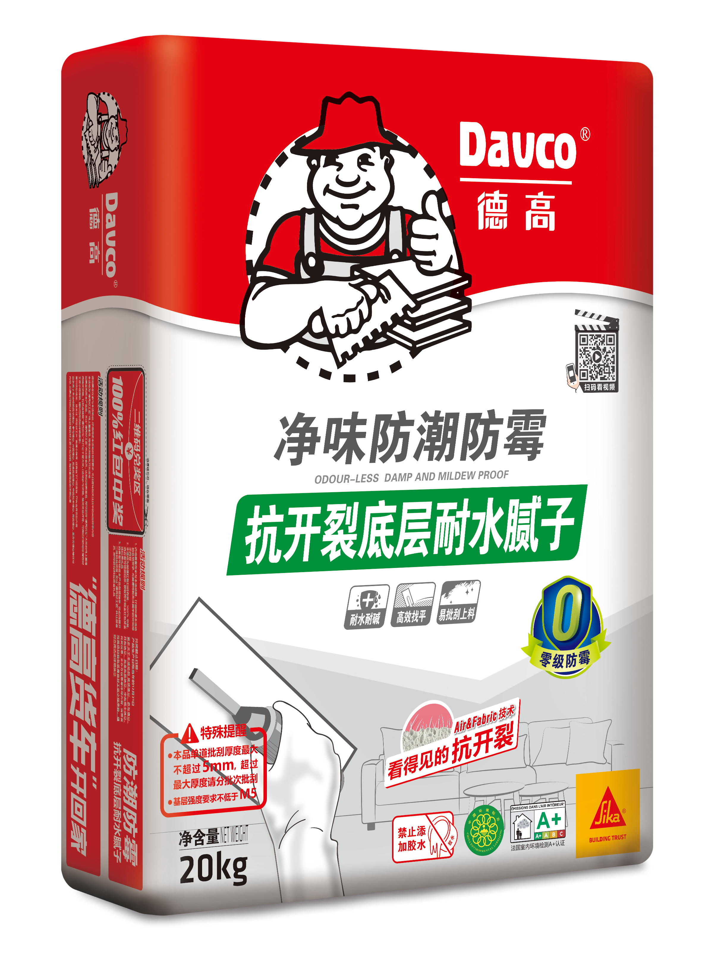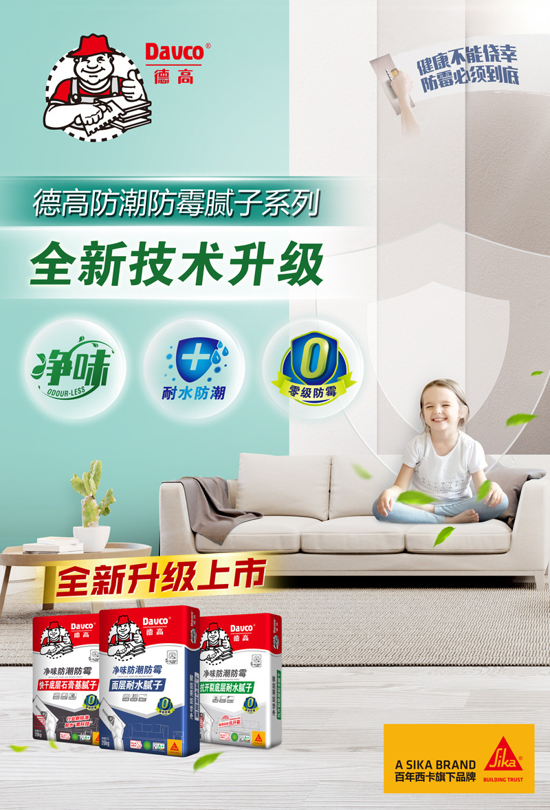 产品简介是一款采用净味配方结合 引气抗开裂技术,通过优质水泥、细砂、抗裂PP纤维、可再分散乳胶粉等聚合物及环保助剂制成的室内用腻子。产品采用先进设备及生产工艺,整个生产过程不人为添加甲醛,绿色环保,达到0级防霉标准。本品用于室内潮湿及非潮湿环境的墙体基层找平处理,耐水防潮,找平高效;添加的抗开裂纤维,大大提升抗开裂性能,配套德高净味防潮防霉面层腻子使用,墙体平整度好,安全环保、坚固、耐久。