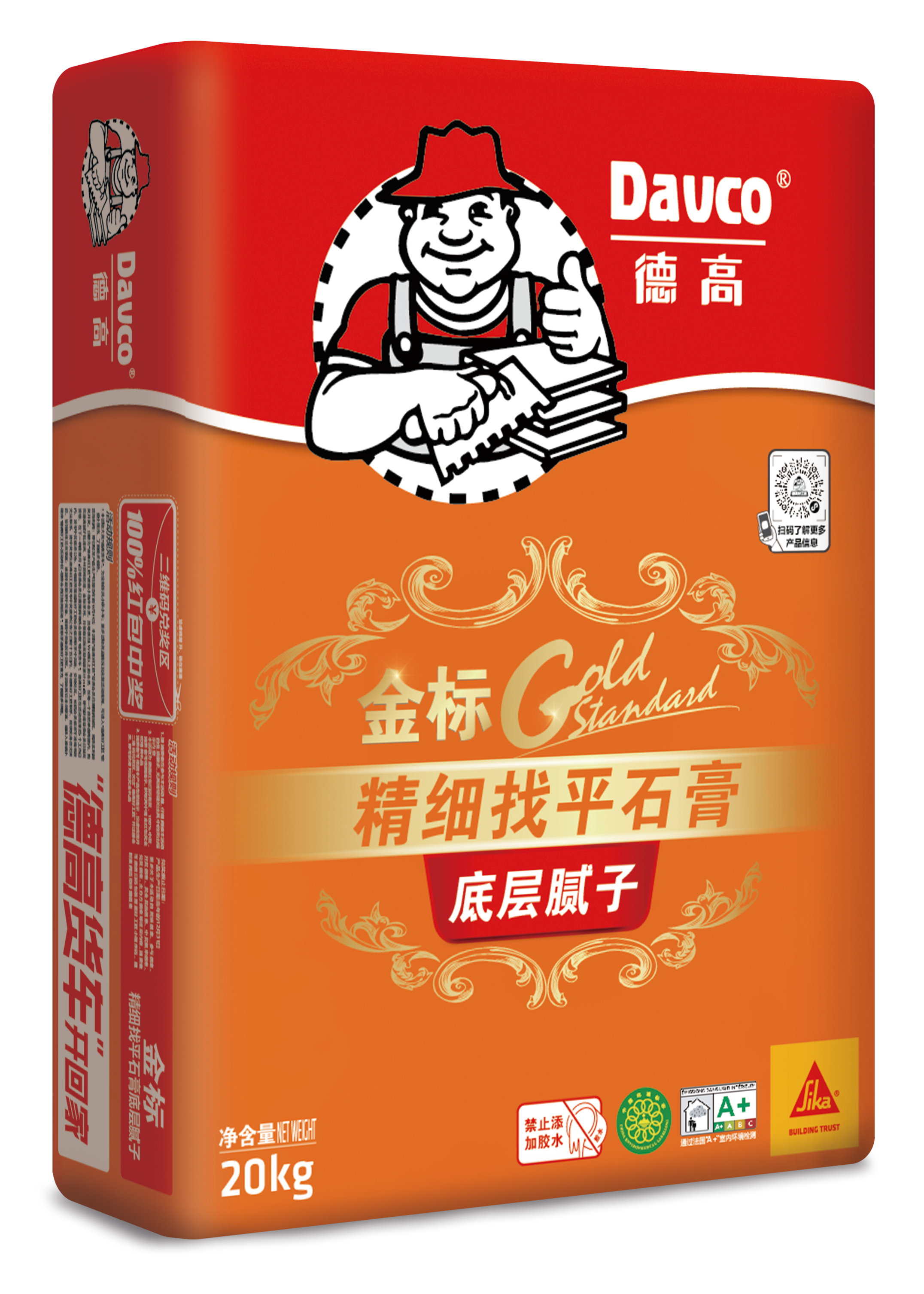 产品简介德高金标精细找平石膏是由优质脱硫石膏、细砂、碳酸钙粉和功能添加剂等为主要原料制成的一种细砂型室内墙面基层抹灰材料。产品配方设计和生产过程中未人为添加甲醛、VOC、 苯系物、重金属等,从原料到生产,安全环保。本品较普通粉刷石膏粉质更细腻,可用于室内墙面和顶棚等基面的薄层抹灰找平和阴阳角拷角处理。本品批刮流畅,找平后效果均匀平整,表面细腻。干固后强度高,不易脱粉,不开裂,不空鼓,耐久坚固。配套德高金标加固剂及德高金标面层腻子使用,墙体平整、坚固、耐久。